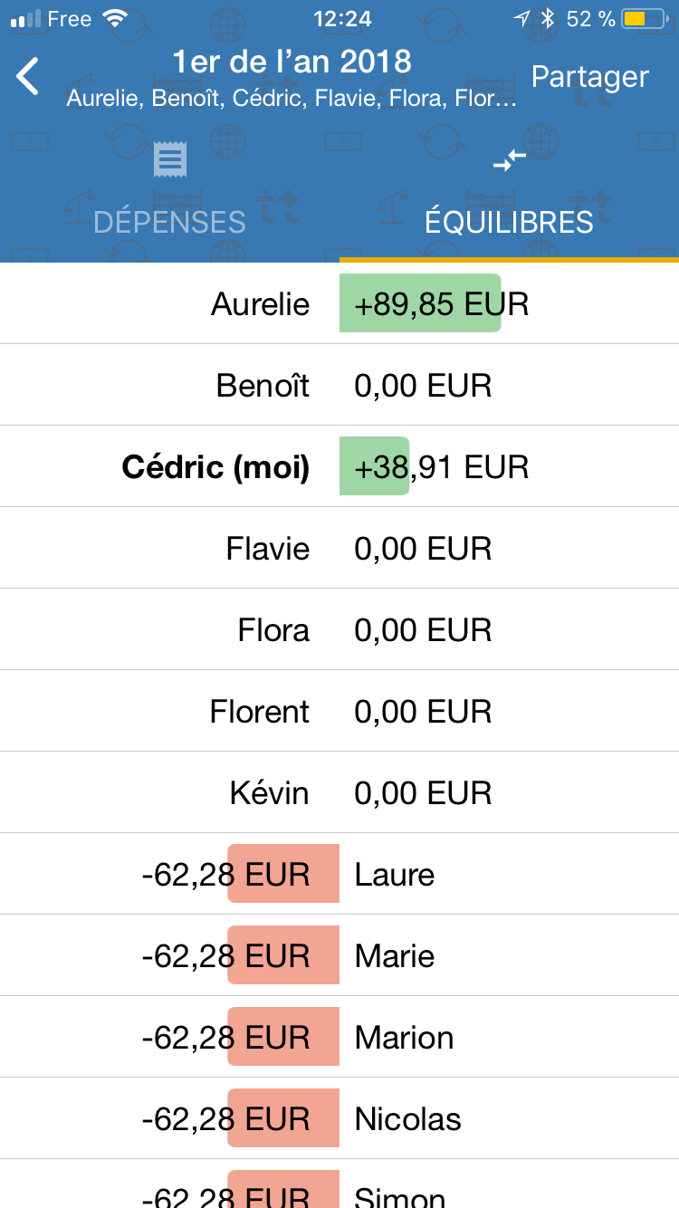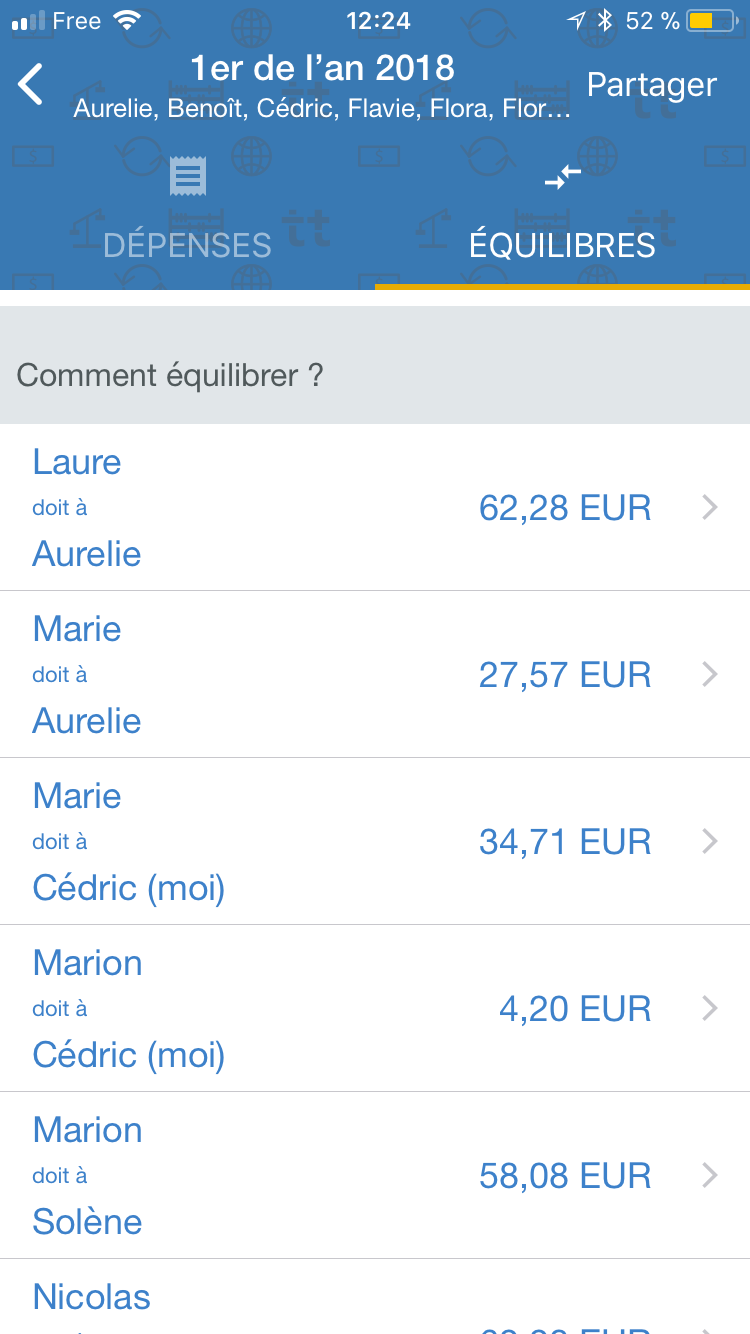 Pour terminer, dans la partie « Équilibres » vous trouverez une liste affichant qui est en positif ou négatif, et un peu plus bas, Tricount calcule automatiquement à qui chacun doit de l’argent. Et ce de façon totalement automatique en fonction des dépenses enregistrées, et dans le but d’avoir un montant identique par personne.