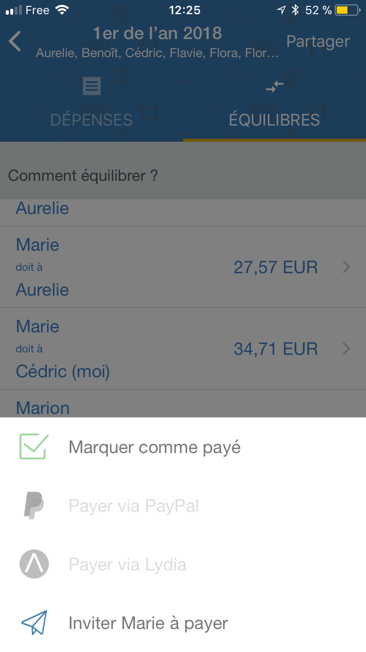 Dans la liste, vous pouvez, en appuyant sur un remboursement, indiquer qu’il a bien été payé, ou bien inviter la personne à faire le remboursement. Un paiement via PayPal ou Lydia est envisageable si vous le souhaitez également !