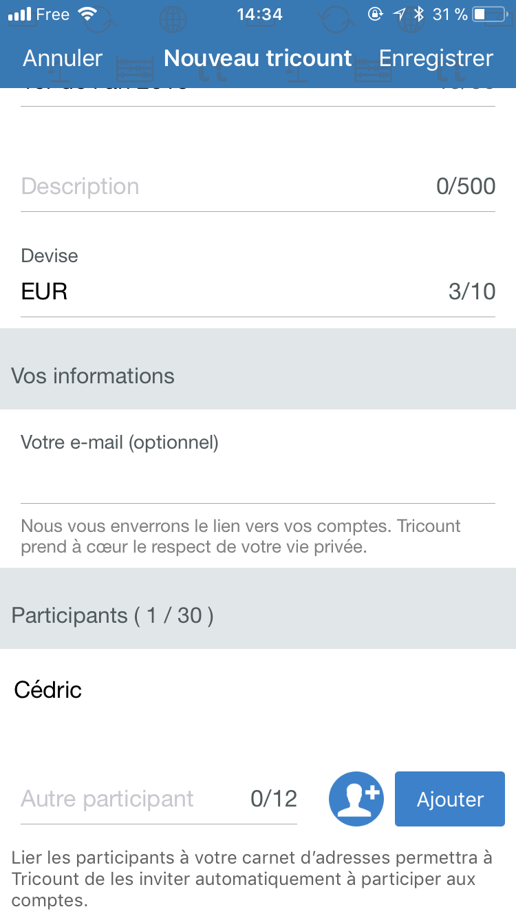 Maintenant, il vous faut créer votre Tricount. Pour cela, il est nécessaire de lui donner un nom ainsi qu’une description si vous le souhaitez et la devise dans laquelle vous souhaitez gérer votre budget.