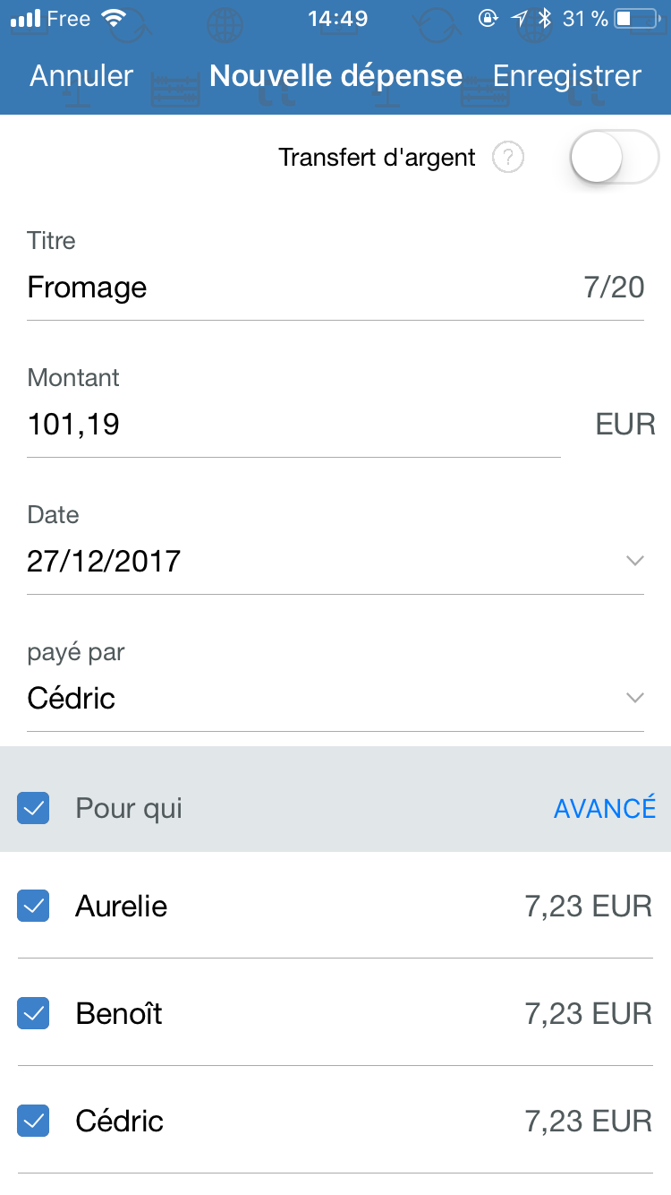 Maintenant que tous les participants ont été ajoutés, il faut ajouter les dépenses qui ont été faites. Rien de compliqué, vous devez simplement indiqué les détails, c’est-à-dire le titre (donc ce dont à quoi elle correspond), le montant, la date, et qui à avancé l’argent. Ensuite, il vous faut cocher pour qui vous avez avancé l’argent afin d’équilibrer les comptes. Dans mon cas, la dépense était pour tout le groupe, j’ai donc coché tous les participants.