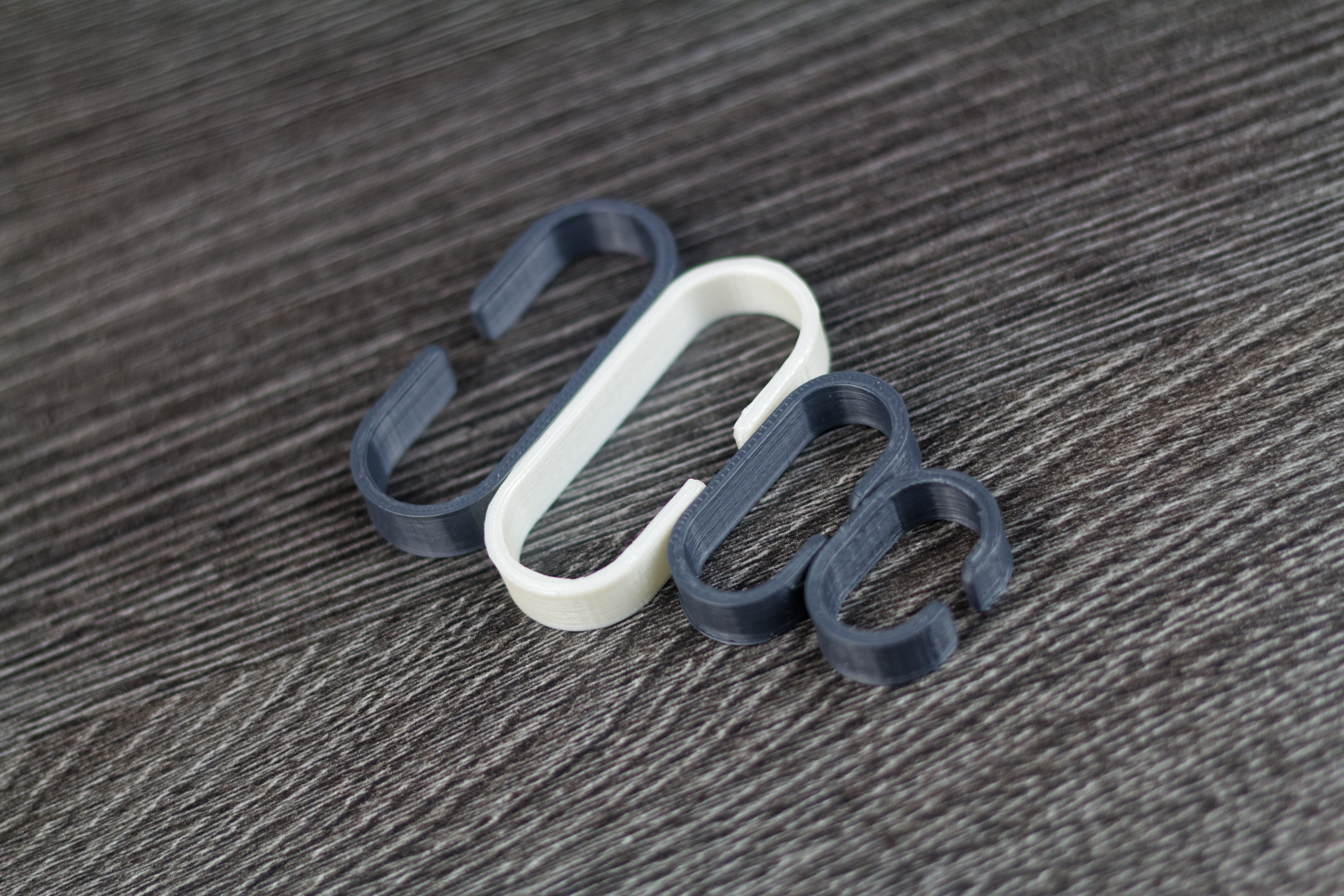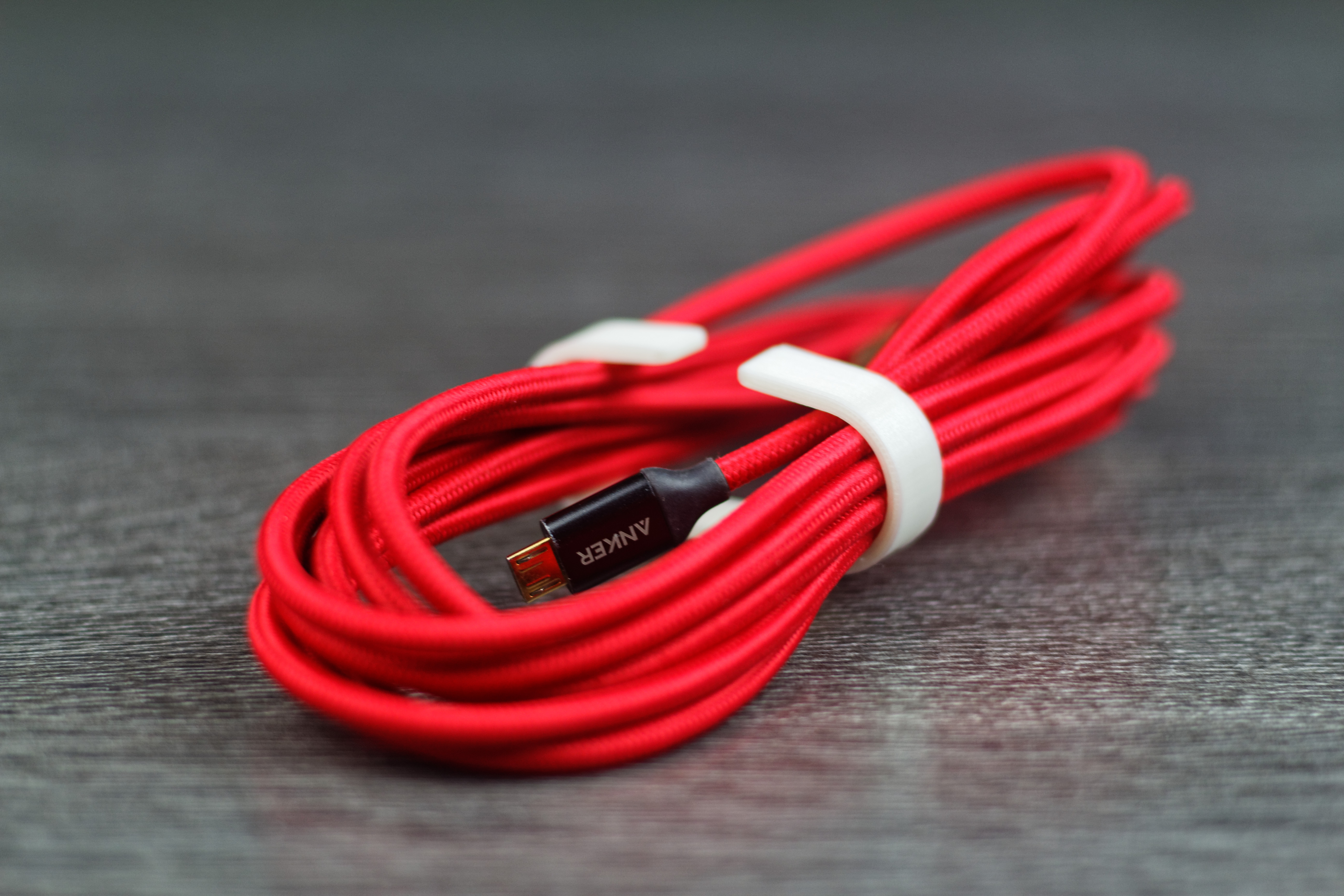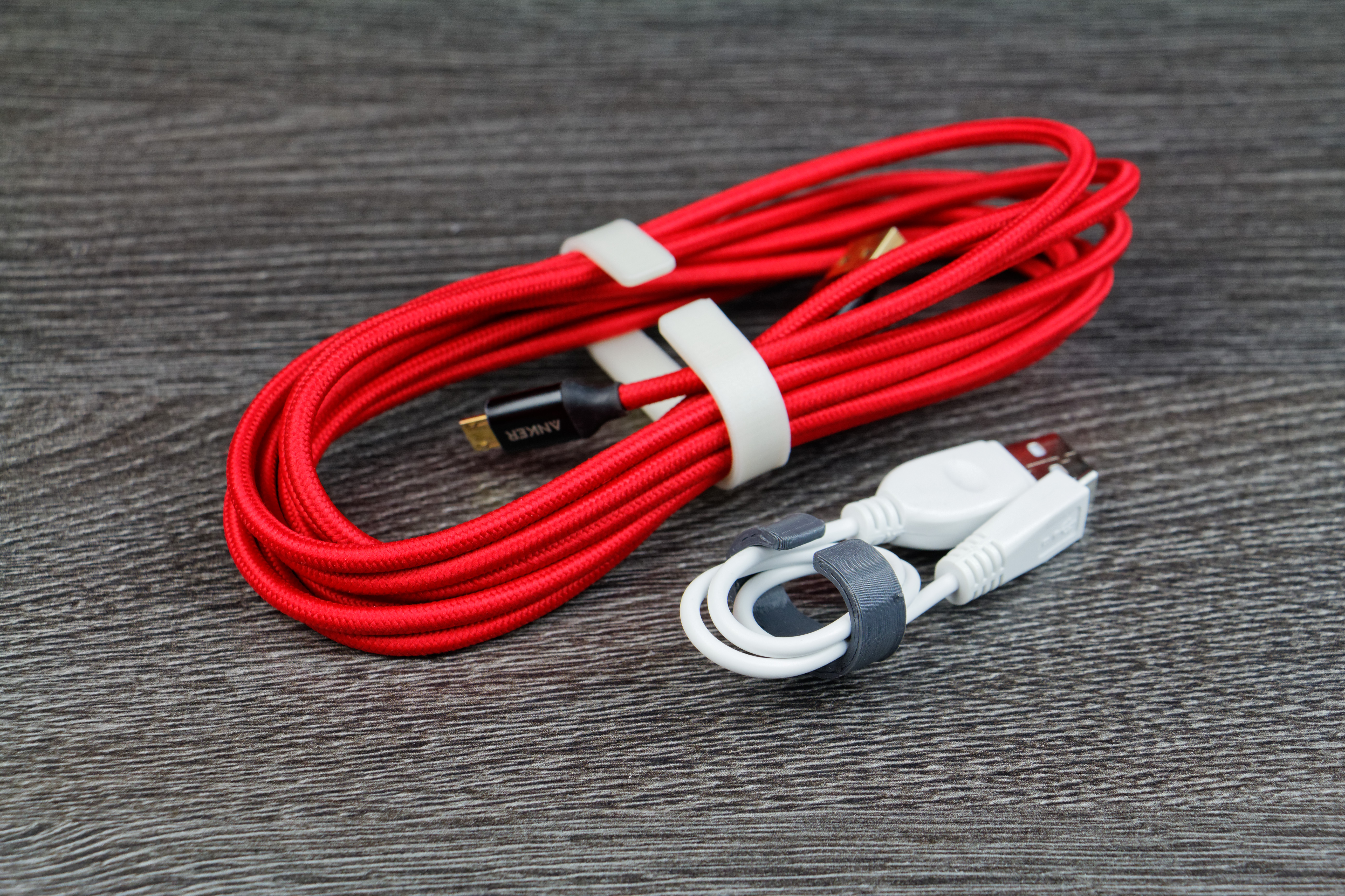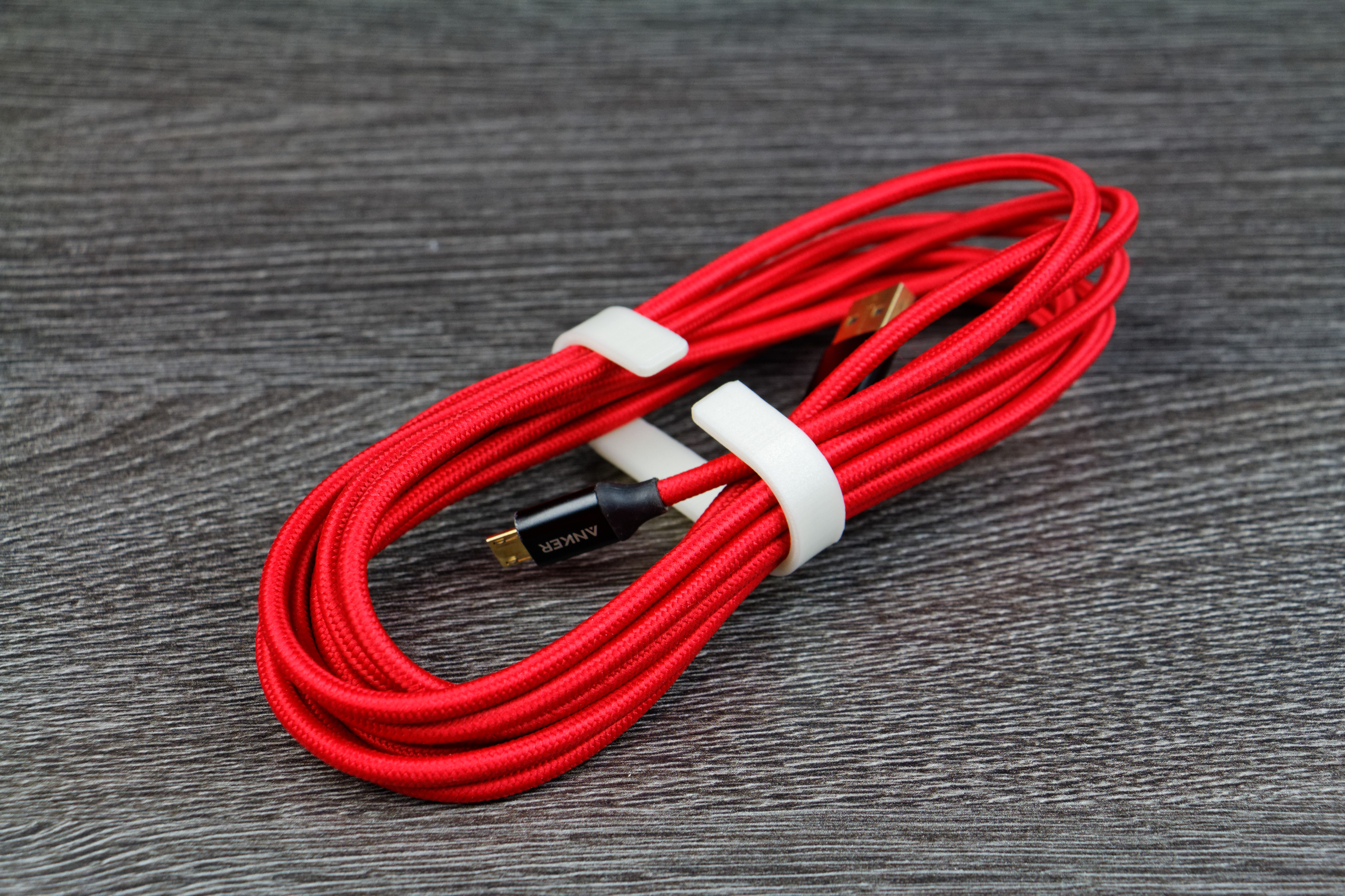 Toujours dans l’idée d’améliorer le quotidien, j’ai également imprimé des ranges câbles, de taille et couleurs différentes. Rien de compliqué, l’idée n’est pas du tout nouvelle, mais cela fait parfaitement le travail. Le rendu avec le câble Anker en Nylon tressé (je vous en ai parlé ici) est juste sublime selon moi.