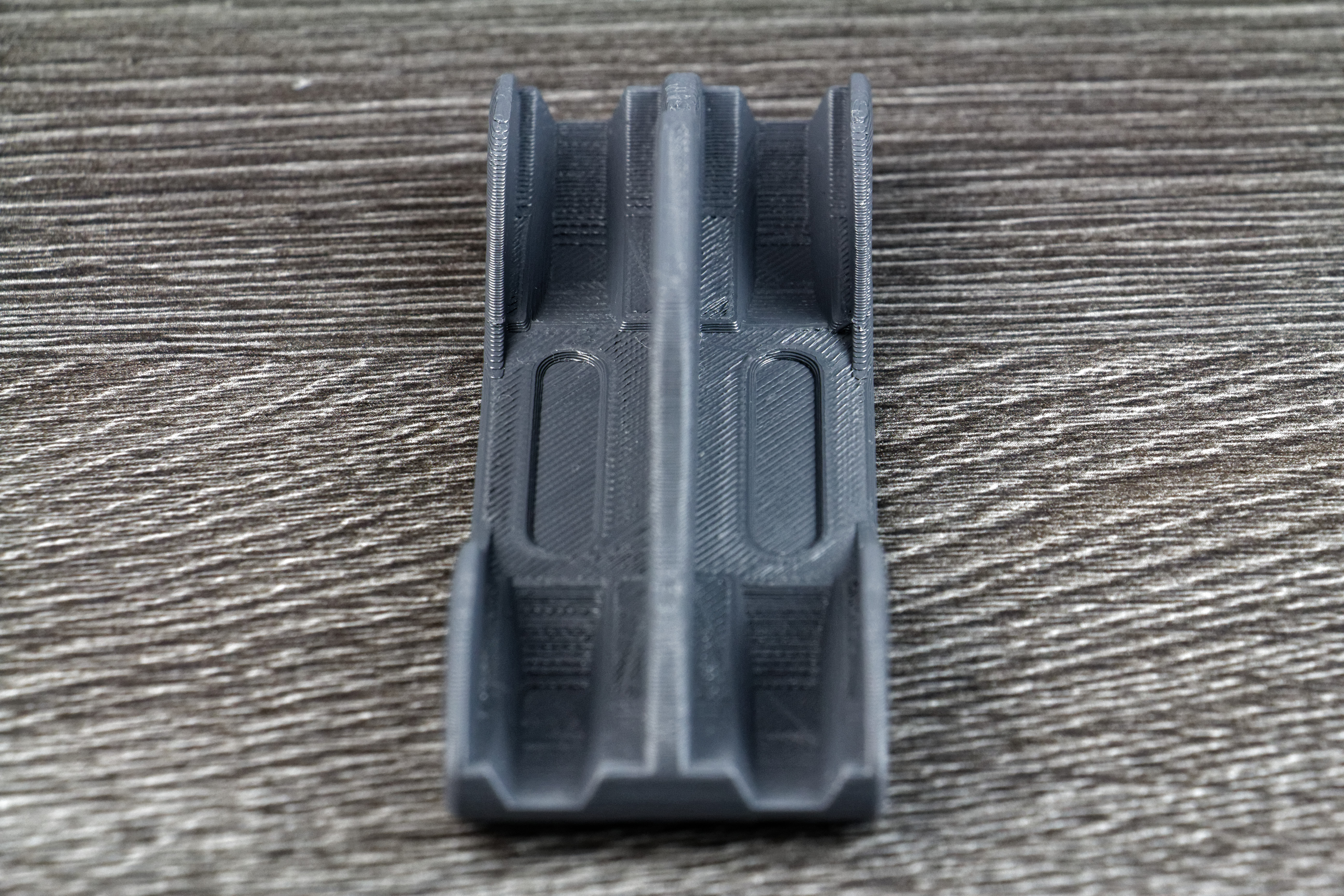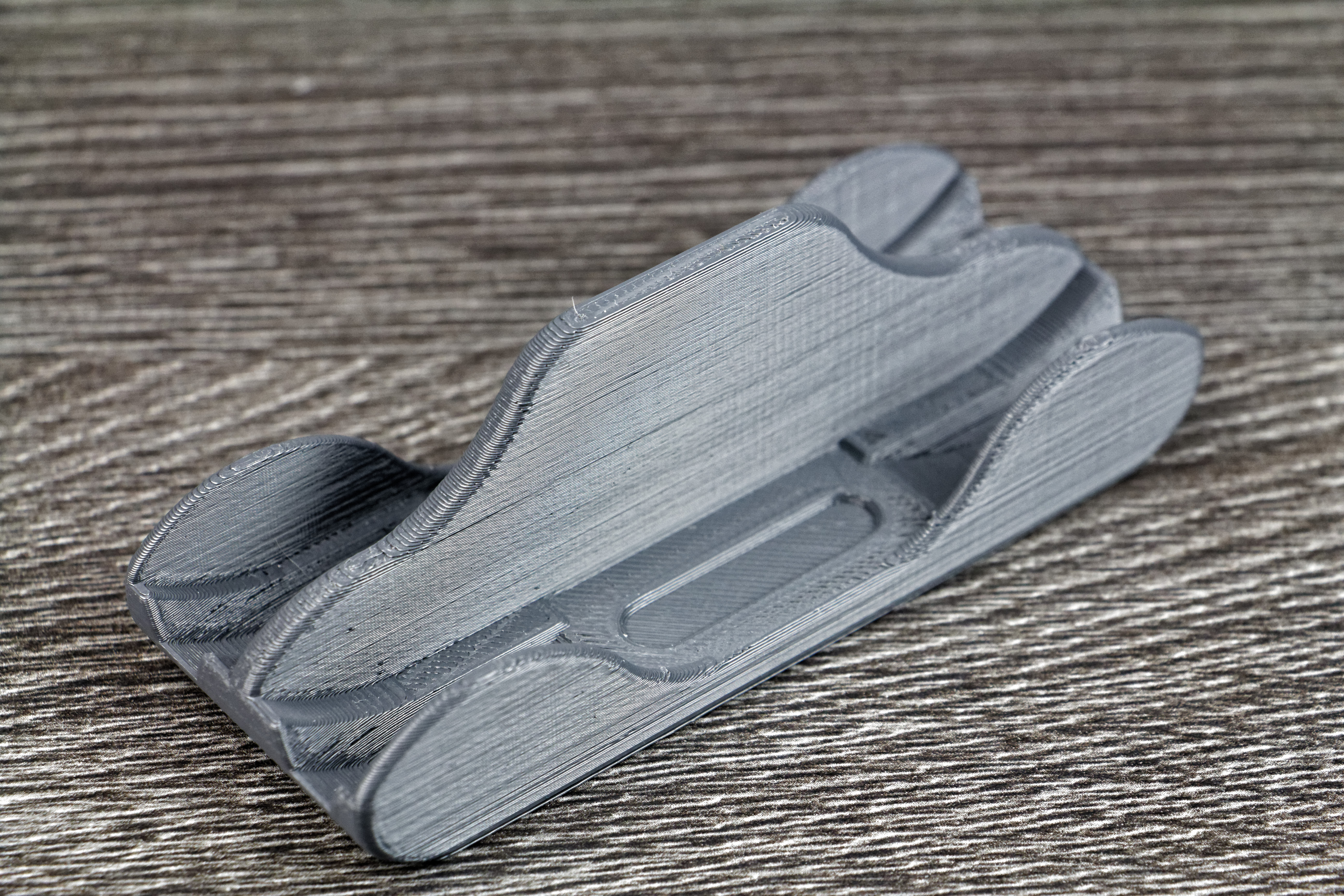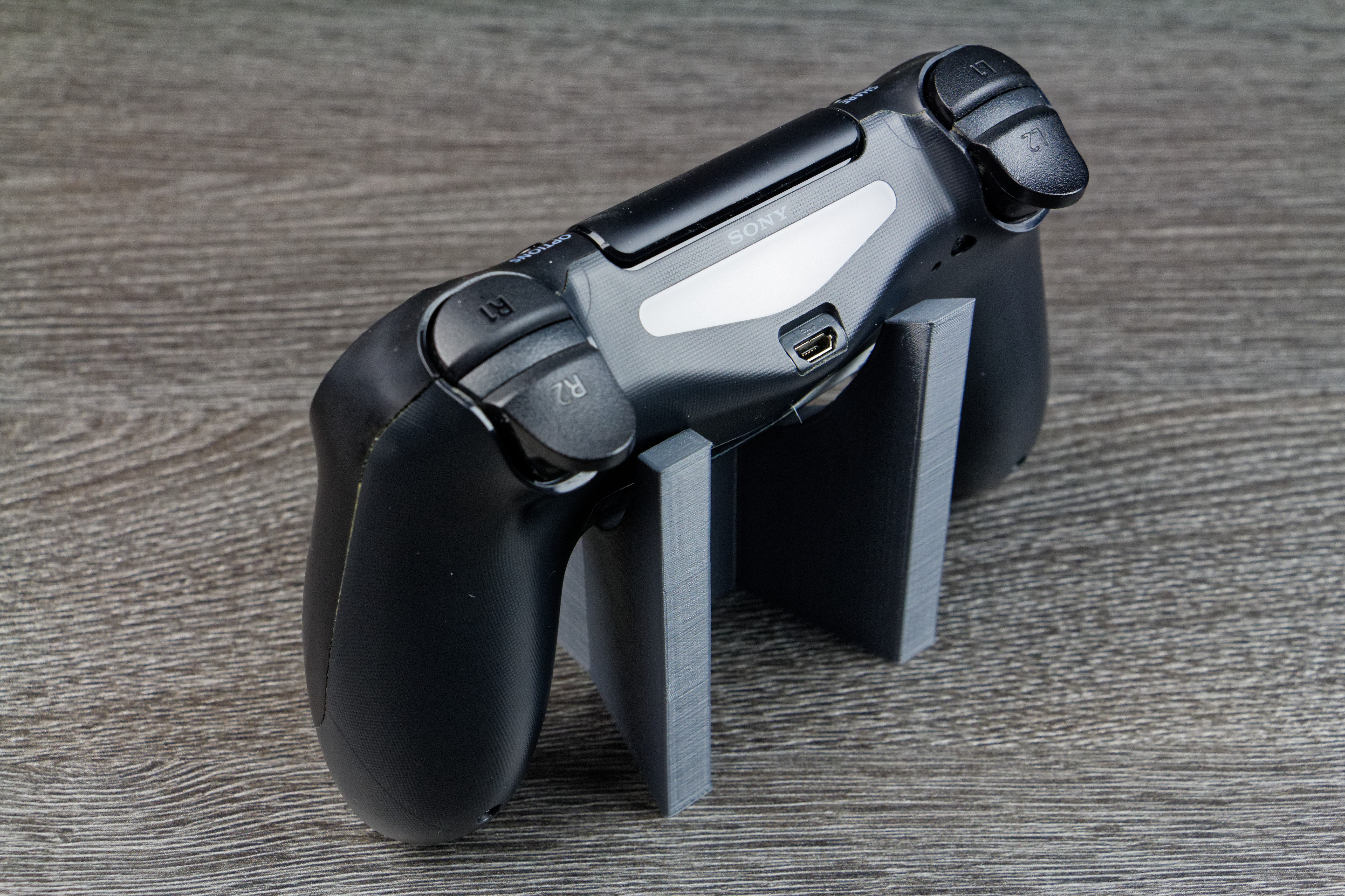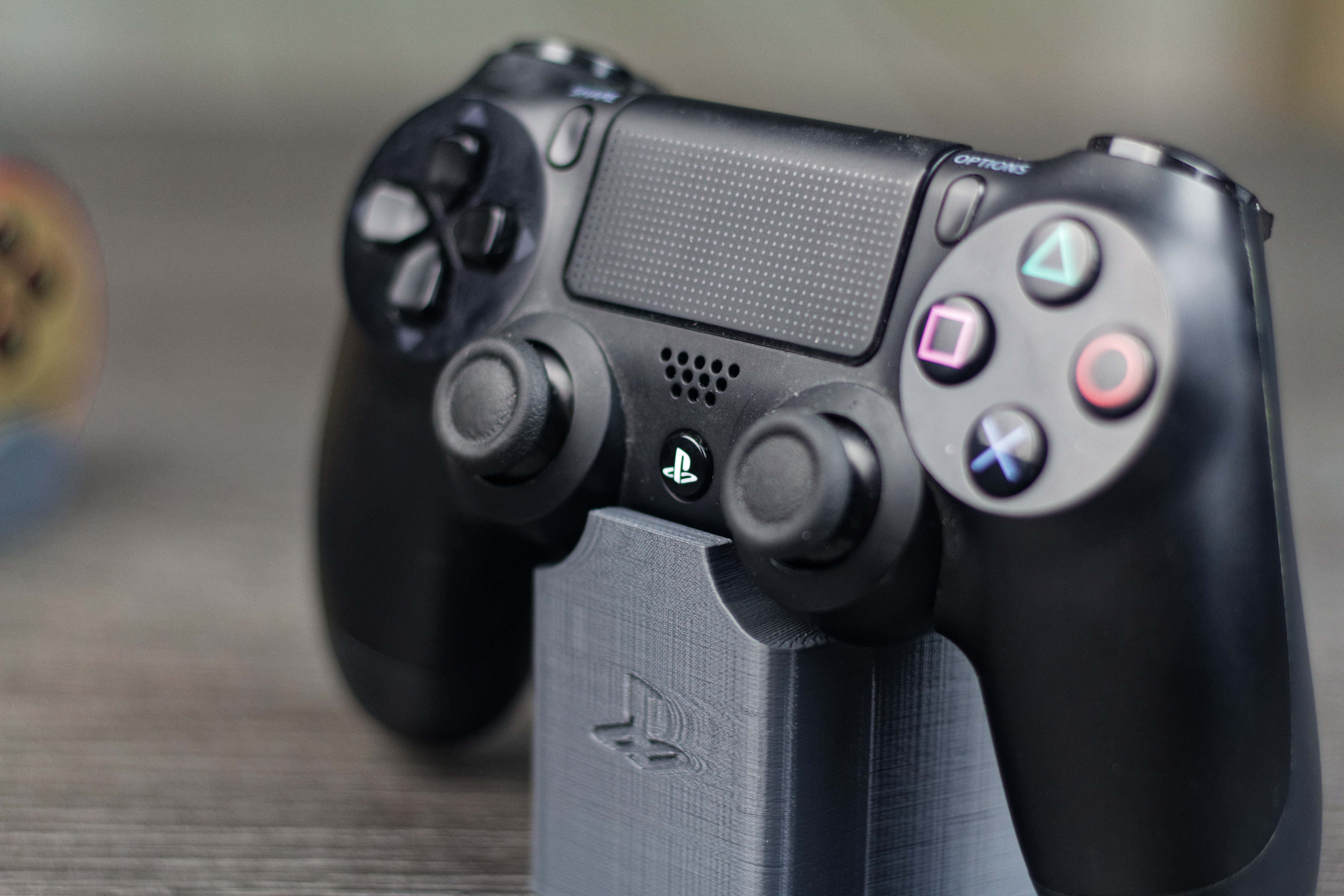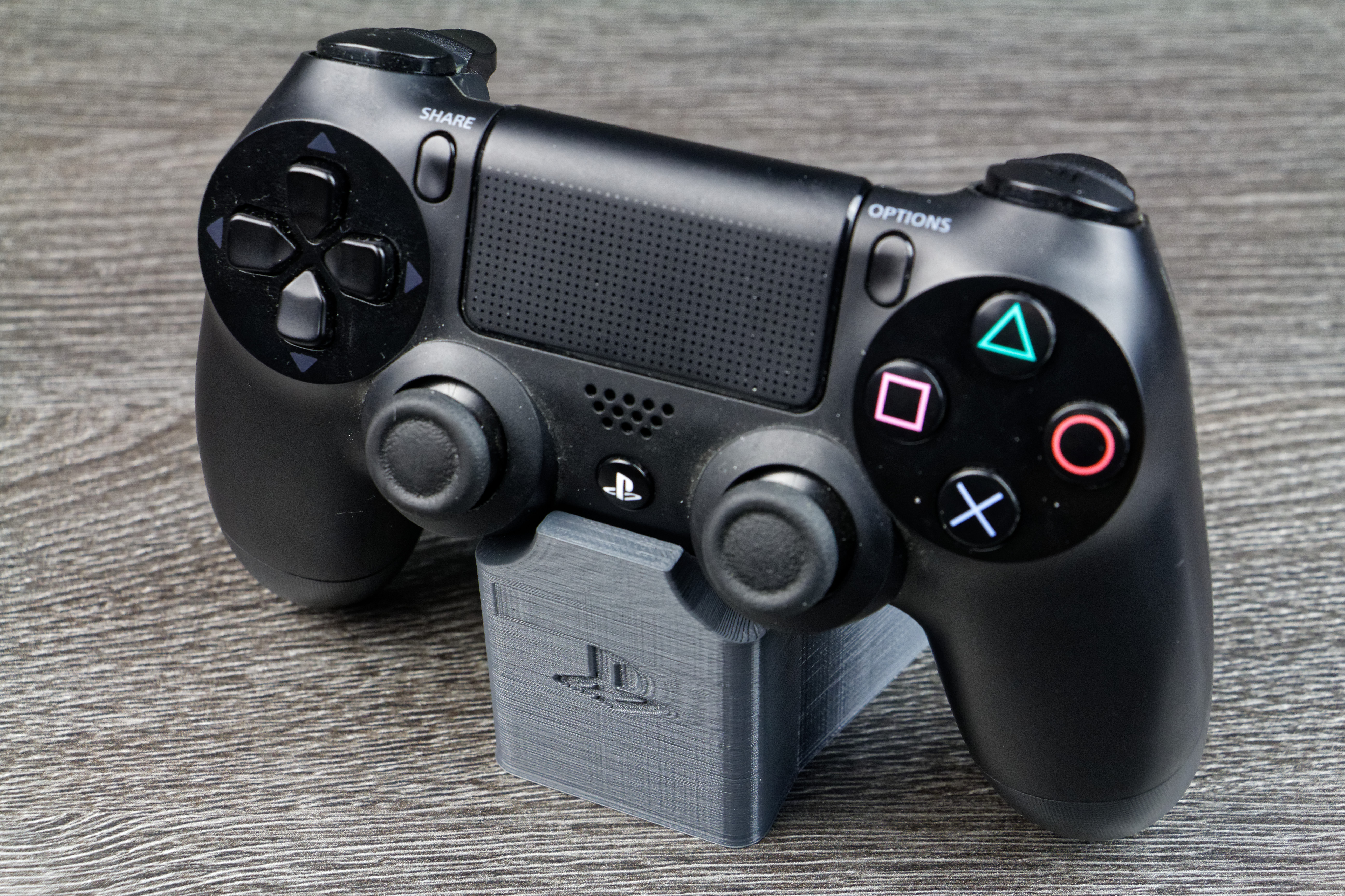 J’ai ensuite recherché un support pour les manettes de PS4. Cette fois, il est un peu plus travaillé puisque le logo PlayStation est « incrusté » dans le support. Après 3h30 d’impression et prêt de 34 grammes de filament (soit environ 1,12€ de matière), le support est terminé.
