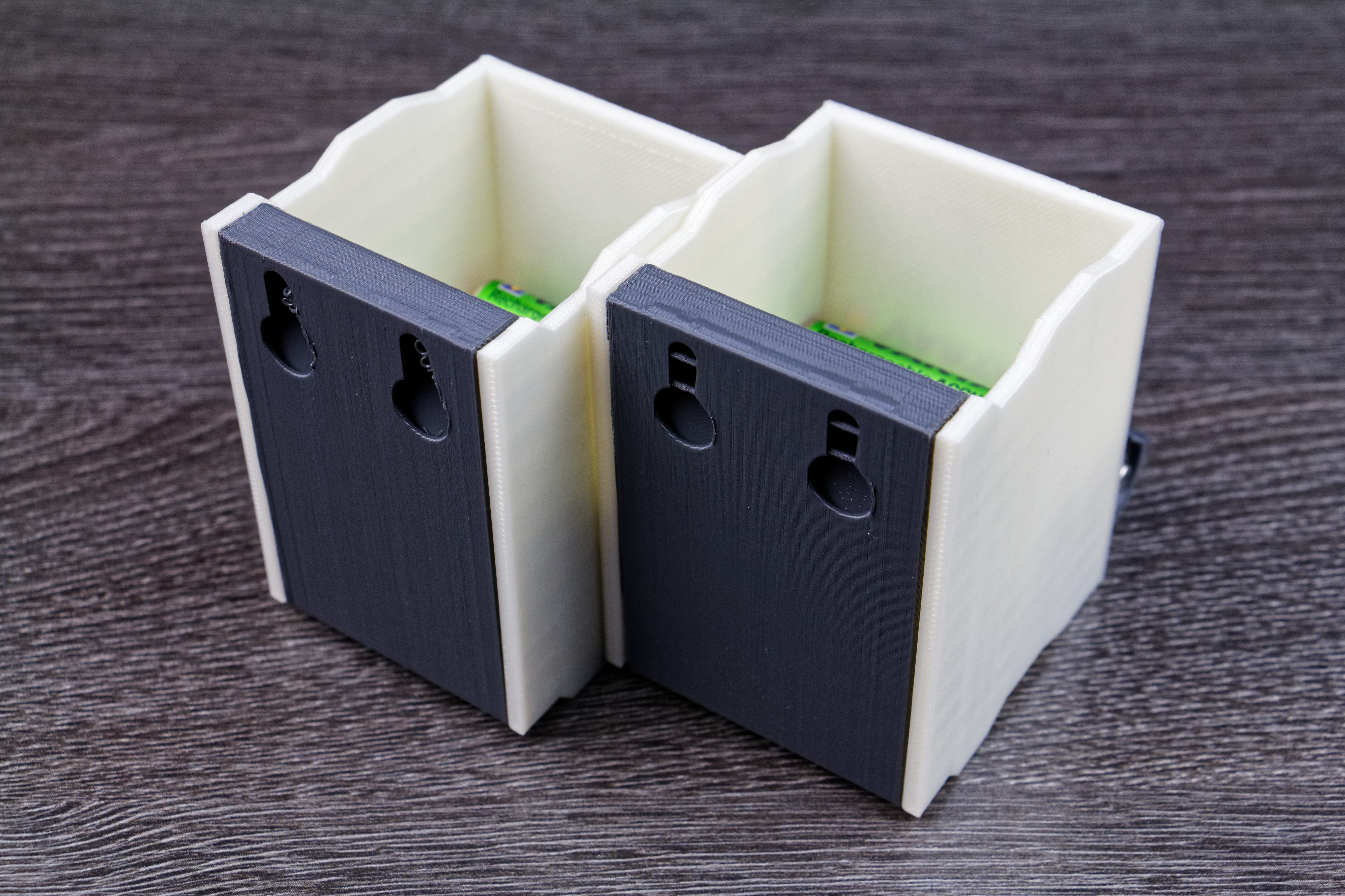 Ce distributeur s’imprime en 3 parties. La partie arrière/inférieure permet de poser et de distribuer les piles. La partie avant/latérale permet quant à elle de retenir les piles. La 3e partie est plus de l’ordre du détail, et n’est pas indispensable à l’objet, mais il permet de savoir facilement le type de pile que contient le distributeur. Les deux premières parties s’assemblent pour former la boîte tout simplement. De mon côté j’ai ensuite collé la partie A3/A2. Les deux parties principales ont pris chacune entre 2 et 4h pour s’imprimer.