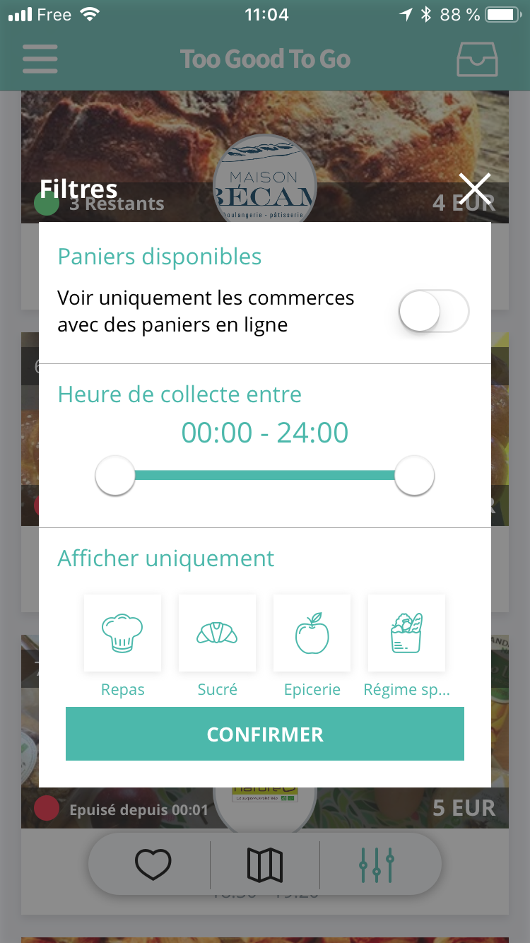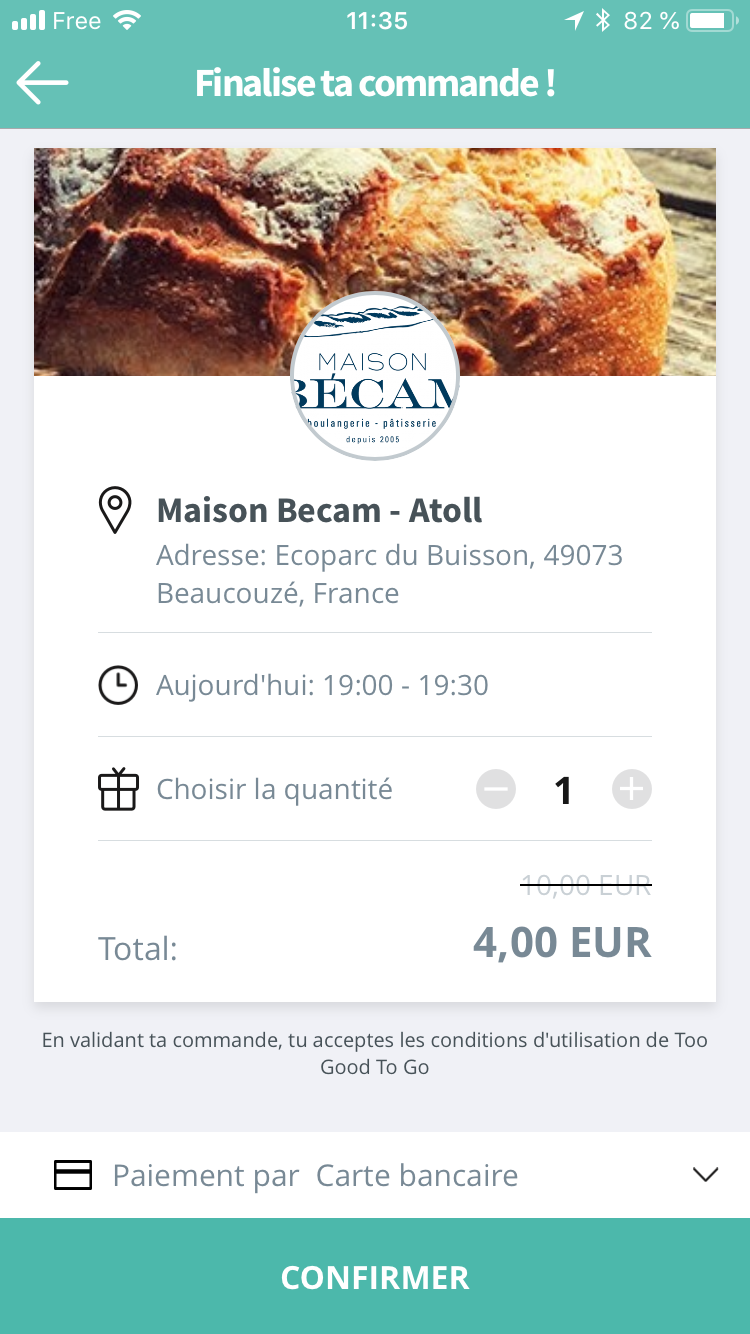 Vous trouvez ensuite l’heure à laquelle vous devez vous rendre sur place, afin de récupérer votre portion surprise. Pratique afin de choisir votre commerçant en fonction de vos disponibilités.