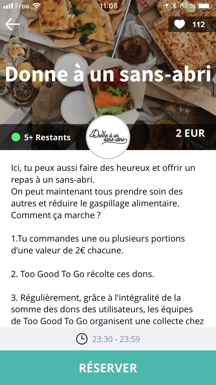 Petite fonctionnalité supplémentaire, qui peut en intéresser certains, c’est que vous avez la possibilité de donner à un sans-abri. Pour 2 €, vous faites un don à Too Good To Go, qui va ensuite organiser une collecte chez les commerçants partenaires, afin de redistribuer des repas à des sans-abri dans la rue.