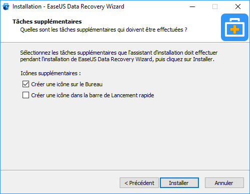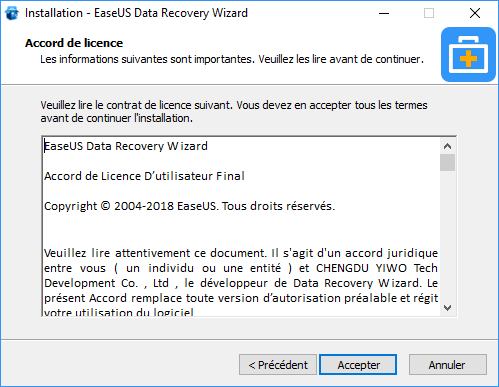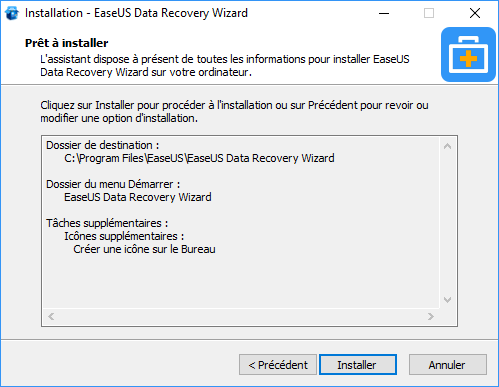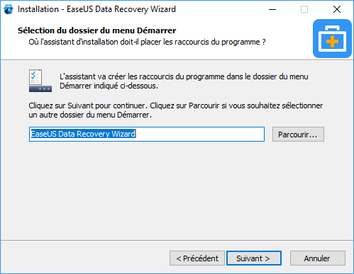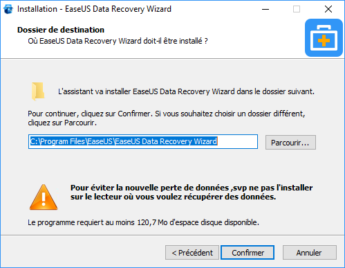 Choisissez l’emplacement dans lequel vous souhaitez installer EaseUS Data Recovery. Il est fortement déconseillé de l’installer sur un lecteur ou vous souhaitez récupérer des données. Lorsque c’est fait, cliquez sur Confirmer, puis sur Suivant.