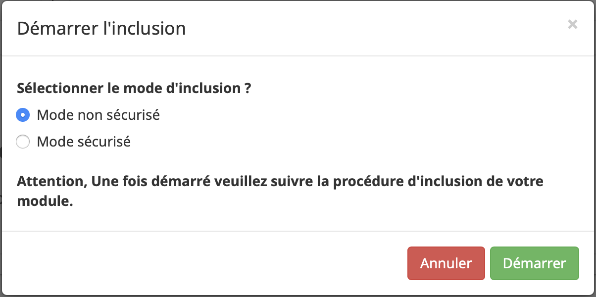 Appuyez ensuite sur mode inclusion, puis sélectionnez Mode non sécurisé