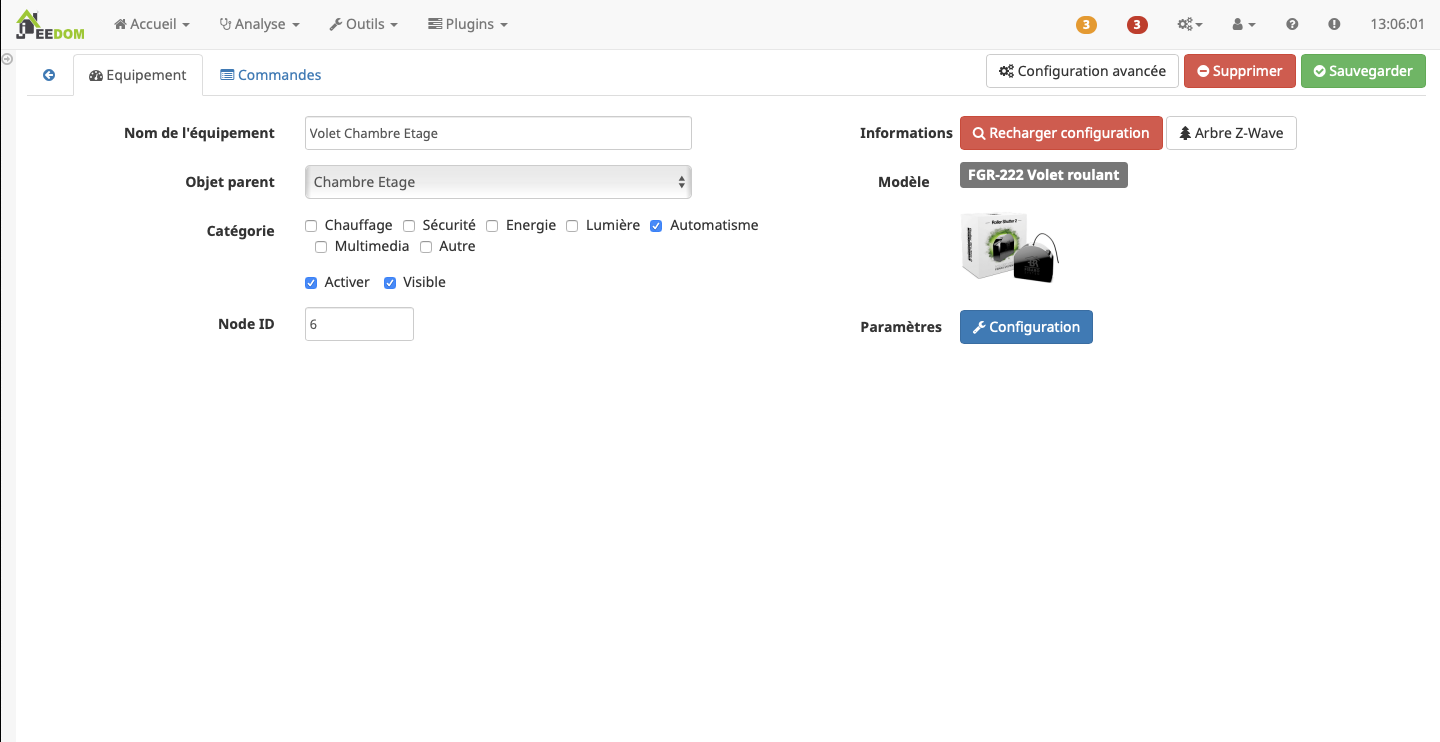 Lorsque vous êtes sûr de votre câblage, vous pouvez remettre le courant, à partir de ce moment, le module passe en mode inclusion, et il vous suffit de vous connecter sur votre box domotique (dans mon cas, Jeedom) pour l’intégrer.