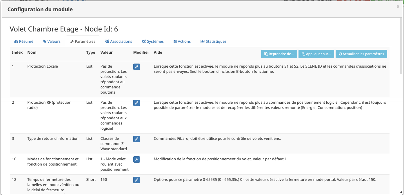 J’ai tout d’abord modifié le paramètre 10 avec la valeur 1 qui spécifie qu’il s’agit d’un volet roulant avec positionnement (ce qui vous permet de savoir la position exacte de votre volet)